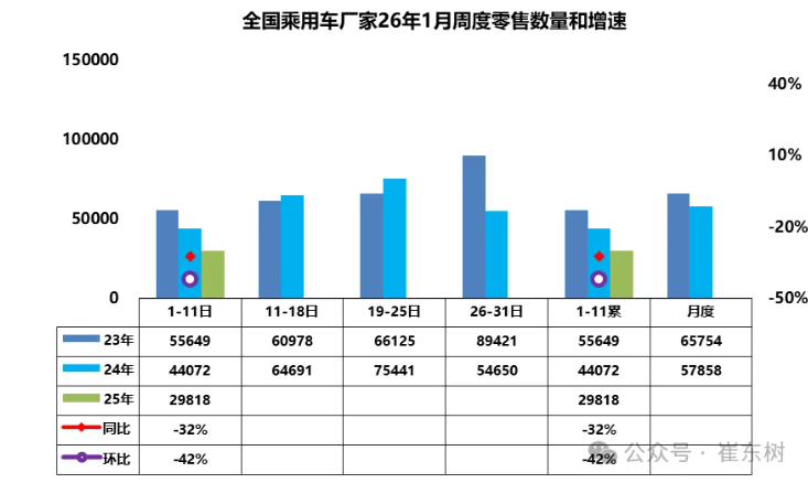 【CNMO科技消息】据乘联会秘书长崔东树最新数据,2026年1月1日至11日量华网,全国乘用车市场呈现明显回落态势。期间厂家批发量为38.1万辆,同比下降40%,环比2025年12月同期下降30%;终端零售量为32.8万辆,同比下滑32%,环比降幅达42%。日均零售约3.0万辆。